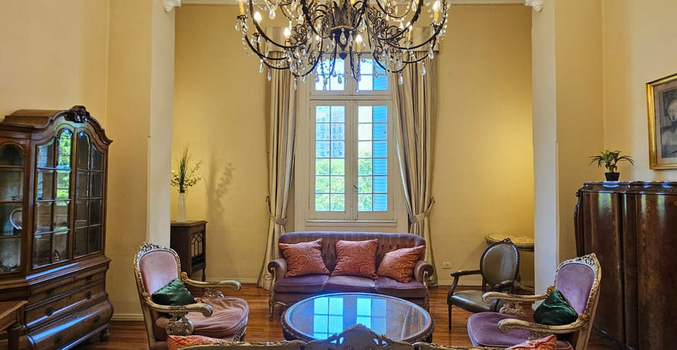 Living & Dining Spaces: The apartment’s common areas showcase elegance and character, with soaring ceilings, polished wooden floors, and statement chandeliers that highlight the classic architecture. One room offers a refined lounge atmosphere with antique seating, tall windows, and warm natural light, perfect for relaxing or entertaining. The adjoining dining space carries a more dramatic tone, with deep red walls, heavy curtains, and a long wooden table that sets the stage for shared meals or formal gatherings. Together, these spaces balance sophistication and comfort, creating a timeless environment to enjoy.