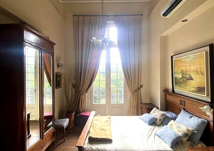 Bedroom 2: This inviting bedroom combines charm with comfort, highlighted by soaring ceilings and tall windows that frame lush views and bathe the room in daylight. The space is furnished with a large bed adorned with soft cushions, complemented by antique wooden pieces such as a wardrobe, bedside tables, and a classic desk. Neutral tones paired with warm wood and elegant curtains create a serene, timeless atmosphere, while modern touches like AC ensure convenience without compromising its historic character. This bedroom has a private exit to the balcony.